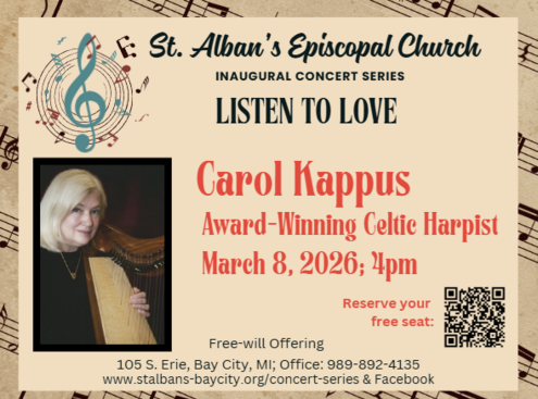 Join Michigan-native harpist Carol Kappus for an afternoon of musical storytelling, featuring the traditional songs of Scotland, Ireland, and Wales. This is the final concert of St. Alban’s 2025-2026 “Listen To Love” Concert Series.