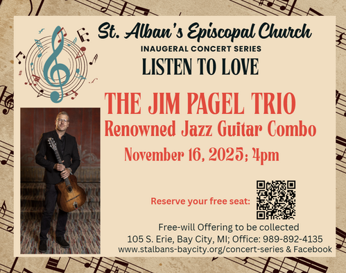 Join St. Alban’s Episcopal Church on November 16th for The Jim Pagel Trio, the renowned jazz guitar trio. With over four decades of guitar experience, Jim Pagel has built a career that blends performance, education, and versatility across nearly every style of music. Jim has been an educator for 35 years, inspiring and mentoring hundreds of students. A guitarist of immense range, Jim is at home in virtually every style—whether it’s jazz, rock, blues, country, or classical —making him a truly versatile and seasoned musician.