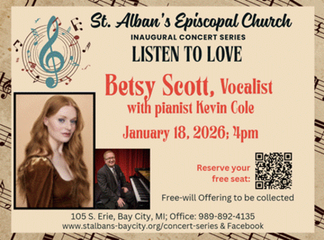 When: Join St. Alban’s Episcopal Church on January 18th at 4pm for Broadway and Contemporary Vocalist Becky Scott with the extraordinary pianist Kevin Cole, two shining stars from Bay City!
