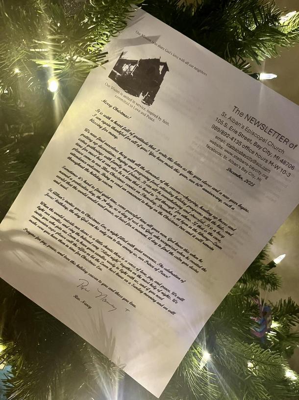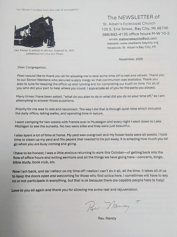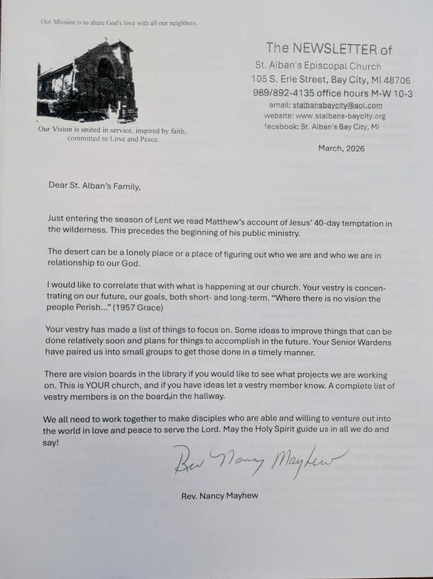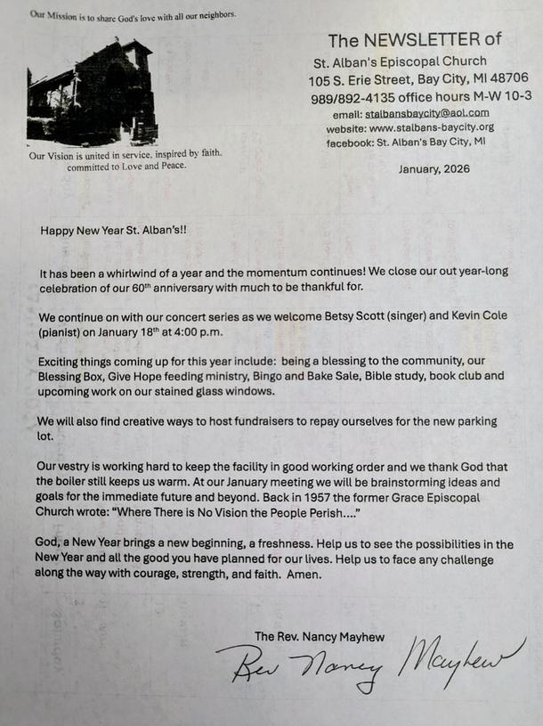 Our monthly newsletter is to keep everyone informed of the happenings at St. Alban's, and copies are placed in everyone's mailboxes once the newsletter is published! If you haven't received your copy and would like one, please contact our office at 989-892-4135.